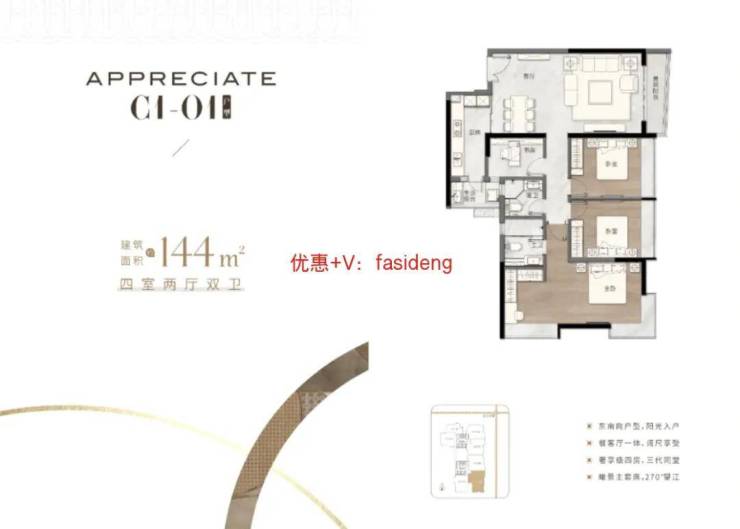 如果预算足够多的话,建面约144㎡的户型绝对是所有户型当中最出色的。该户型位于整个项目的东南角,这也是项目所以户型当中望江观景面最大的户型。其景观阳台和两个卧室均为东向设计,高层单位均可以望江;尤其是主卧,不仅为套房设计,还有270°望江视野,简直壕得不能再壕!