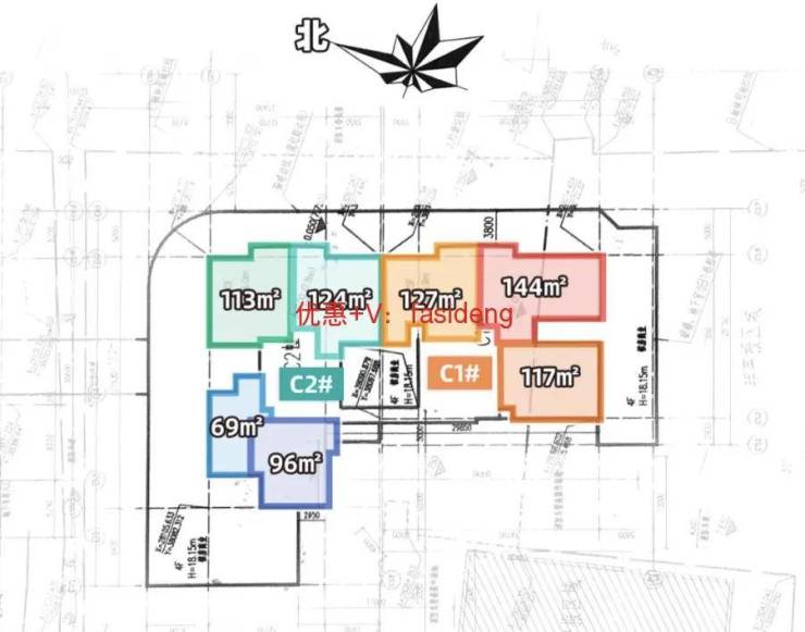 两栋住宅相连,C2户型分为东向的124㎡及113㎡、南向的96㎡、北向的69㎡,即与写字楼对望。