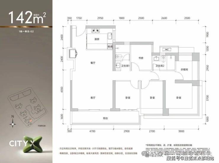 竖厅格局,客厅3.6米开间,四开间朝南,动静分区,分别做到了主卧16.2㎡/次卧9.24㎡/次卧7.76㎡/次卧7.32㎡(包含墙体飘窗),U型厨房,得房率约75.4%(不含赠送),东南或西南朝向。套内面积82.02㎡+赠送面积12.93㎡=实得94.95㎡,加上赠送后得房率约87.28%。