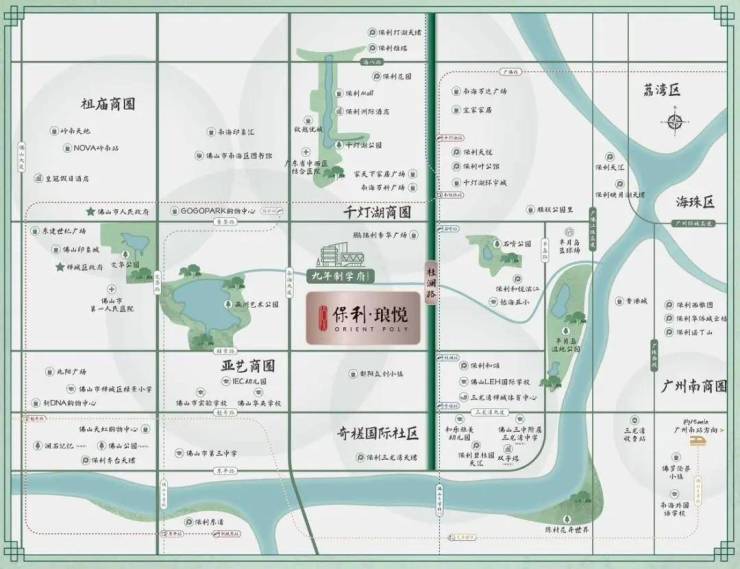项目位于桂城轴心,祖庙亚艺湖千灯湖奇槎十字中心,拥双核利好,尽享第三代豪宅区万象繁盛。