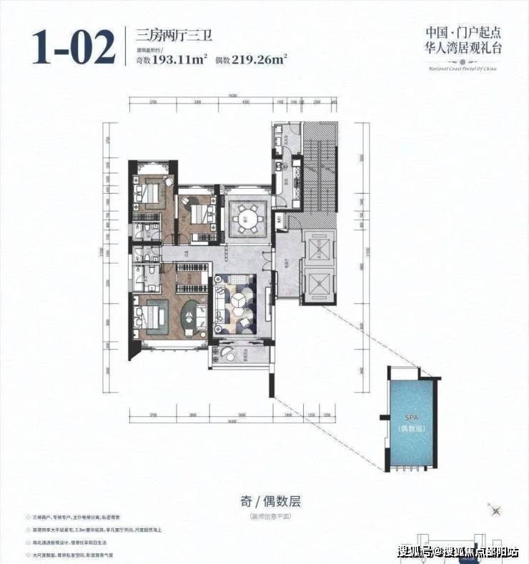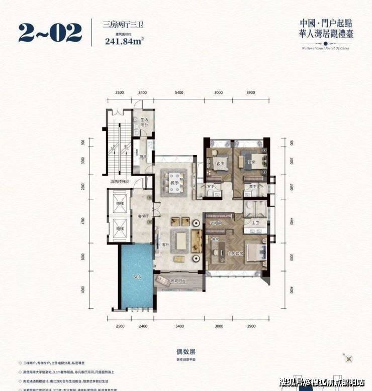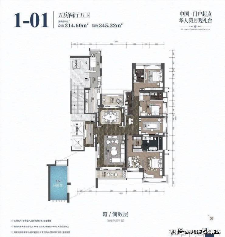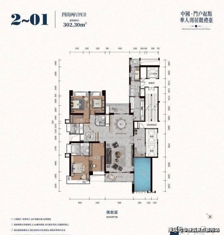 项目户型是正南北朝向纯板式结构,南北通透。内部标准层层高3.3米,偶数层配备的私家游泳池层高超6米。三梯两户,总户数148户的稀缺珍品:194-346㎡大平层海景空墅