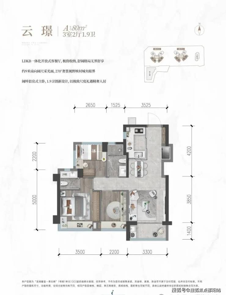 80㎡的3房2厅1.9卫,设计的是竖厅格局,客厅开间3.3米,分别为西南及东南朝向;
