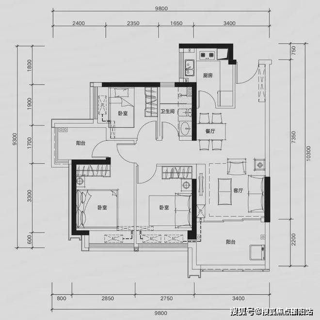 G02户型:约109㎡ 四房两厅两卫: