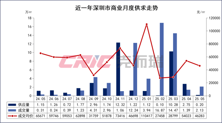 5月,深圳供应2宗居住用地,总建面13.57万㎡。成交2宗商办地,总建面26.21万㎡。