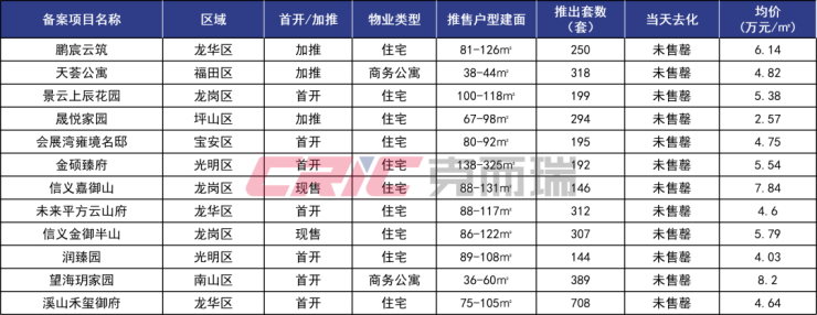 2025年5月,据CRIC市场监测,共有12个项目开盘加推入市,其中首开7个,现售2个,加推3个,分别是10个住宅项目,2个商务公寓,共推售3454套。2025年5月深圳市开盘项目分布图