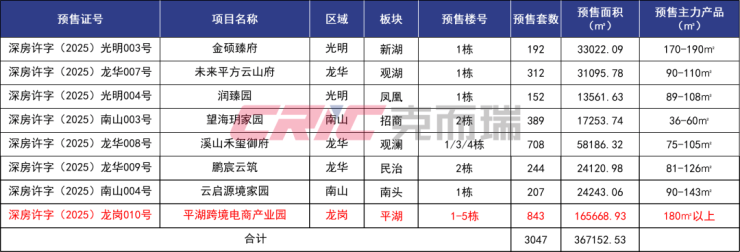 根据CRIC市场数据监测,本月商品房共有8个预售证获批,共计3047套房源,合计约36.72万㎡。其中6个住宅项目获批预售,共1807套住宅房源。2025年5月深圳商品房预证项目详情表