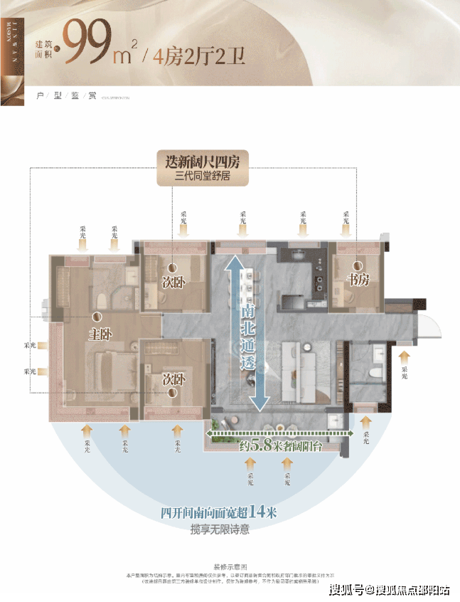☑️ 约99㎡奢阔4房|近乎传统120㎡舒适感✨约14米南向面宽+约5.8米阳台,客餐厅南北对流✨约5.8米横厅平层空间质感,更懂生活的奢阔尺度✨约25㎡套房主卧+270°L型飘窗,非凡起居日常