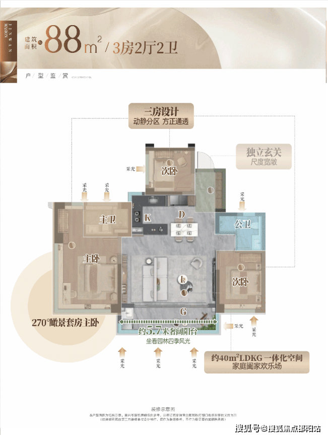 「四代宅」产品力 刚需面积兑现改善生活☑️ 约88㎡舒适3房|媲美传统100㎡三房✨约40㎡LDKG一体化阔厅,是家庭社交核心场域✨约5.7米宽景阳台,打造“城市微度假”的私域✨270°瞰景套房主卧,让私密与仪式感双重在线