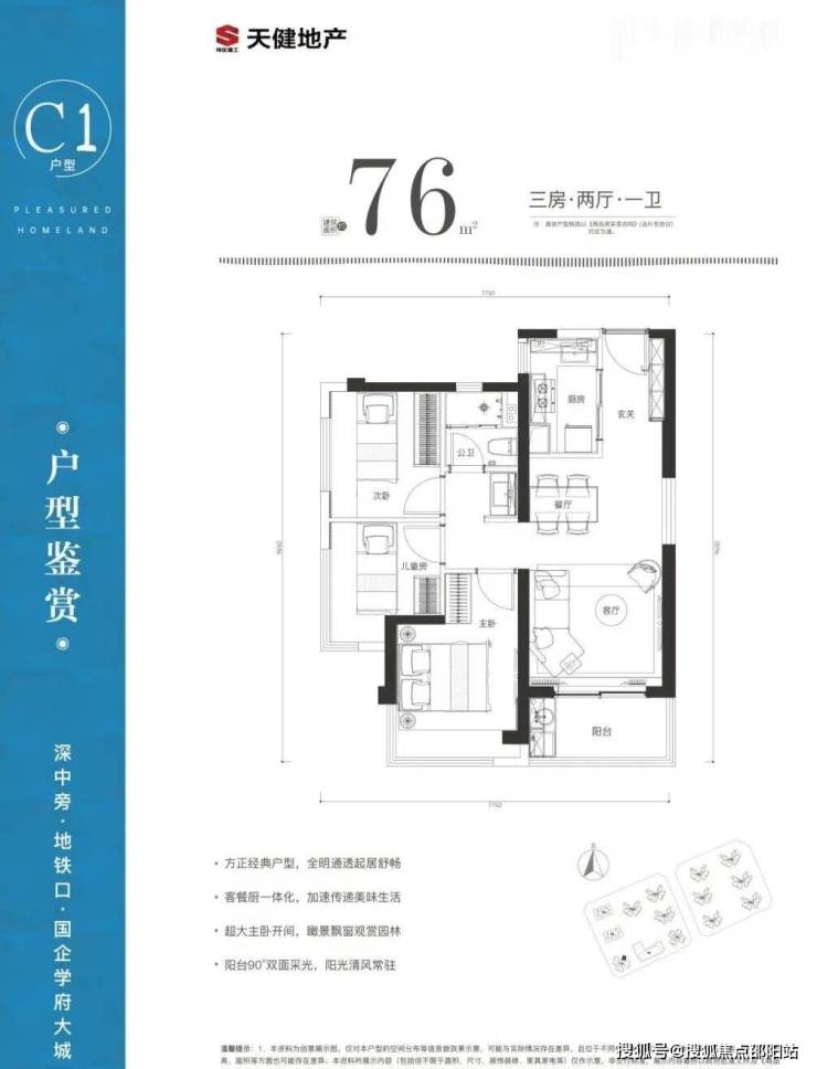 76㎡的3房2厅1卫,设计的是竖厅格局,进门入户玄关,客厅3.3米开间,得房率75.05%(不含赠送),阳台朝西北、西南或东北向。