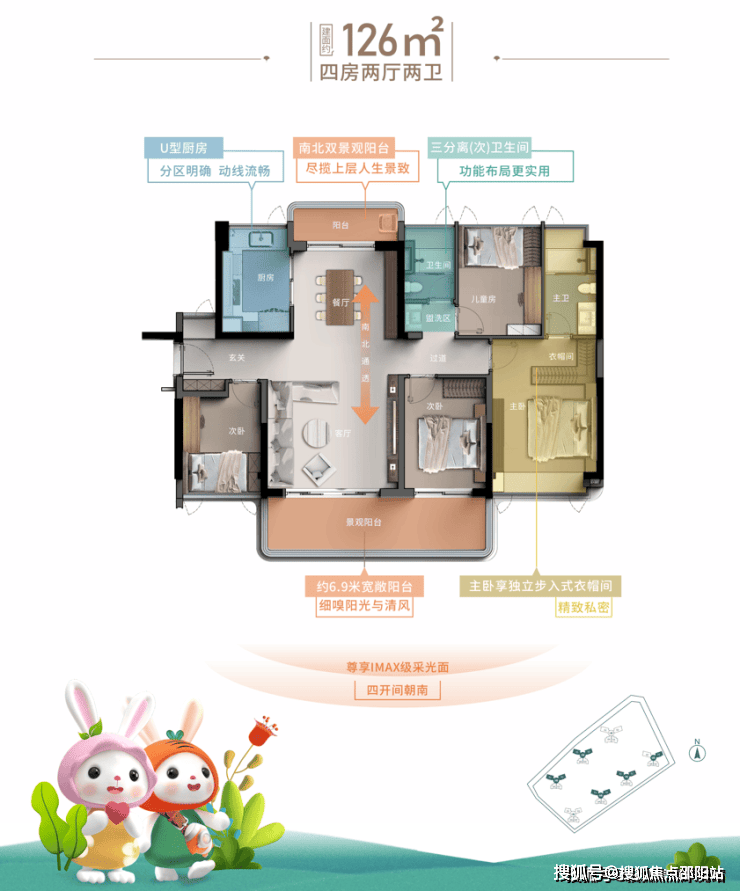 建面约126㎡四房,四开间朝南,南北对流双阳台的设计,通风采光良好。约6.9米横阔主阳台连通次卧,最大程度延伸了空间的尺度感。主卧套间可以作为带有独立衣帽间;公私卫生间均带有窗台,提升使用便利度。