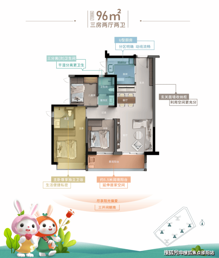 建面约96㎡的三房,拥有约5.5米的阔绰阳台,超大开间,同时还有约22㎡的大主卧空间,该户型实用率高,多飘窗、长收纳玄关、双跨阳台、主卧独立套间等配置,南北通透、动静分离,符合刚需客群需求。