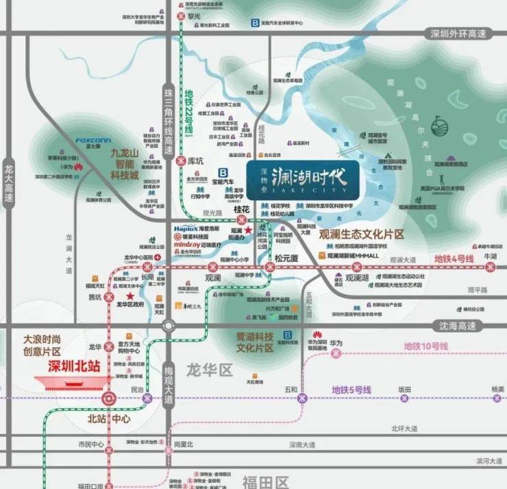 ●片区现有富士康、华润三九、长安标致雪铁龙等龙头企业入驻,华为将拟建76万㎡新能源大厂,迈瑞亦布局建设医疗器械标杆制造基地,观澜成为大湾区产业高地,高净值尖端人才涌入,就近置业需求井喷。