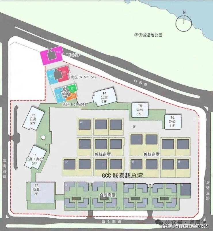 位于深超总东端,东面是华侨城蓝楹万,南面是TCL和学校用地,西面是京东深圳总部,北面是华侨城湿地公园。