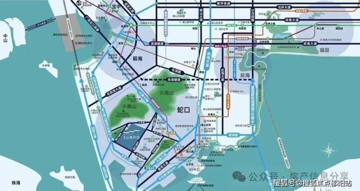 项目位于2号线和5号线交汇的赤湾地铁站,项目紧邻赤湾站——2号线与5号线的交汇站约1.3公里,未来公共交通发达。同时项目可通过小南山隧道或港航路汇入兴海大道,连通前海、后海、宝中等区域。