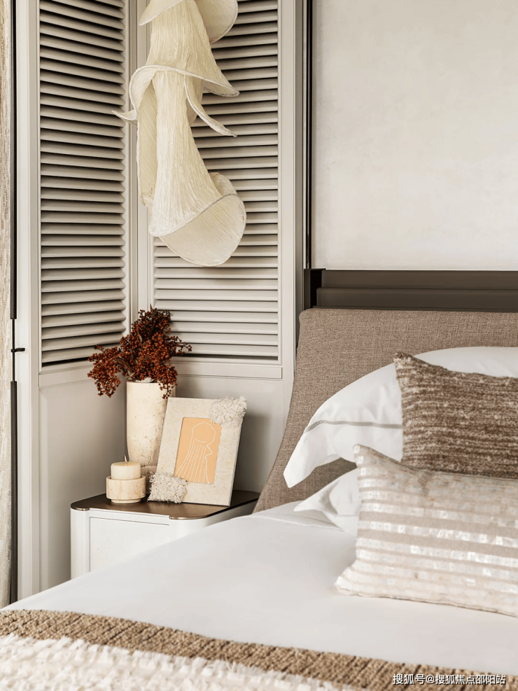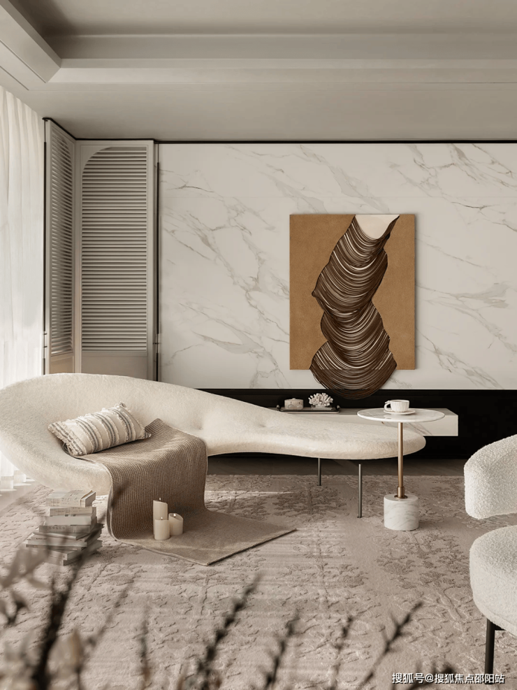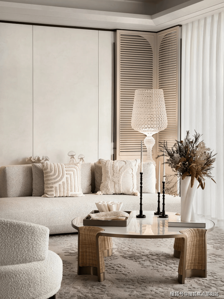 奶油色、浅米色与充满海洋元素的贝壳、绳结、海星等具有人文气息的手工艺术品点缀,将大海装进空间里。客厅的多人沙发Gallotti&Radice 、B&B休闲长凳、石材与金属相融合的藤编茶几,呈现出自然精致与现代交汇的流动美感,在静谧中透出一丝克制的奢华感。