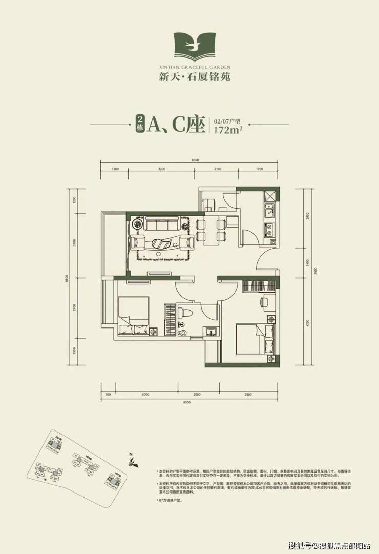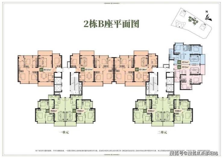 2栋B座二单元04、05户型:面积约为72-74㎡的2房2厅1卫。