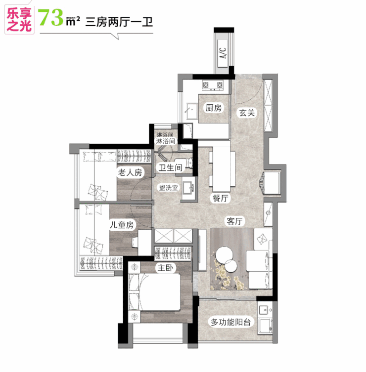 建面约73㎡的三房户型为例,实用率超过80%,整体设计紧凑但不拥挤,动线合理,采光充足。