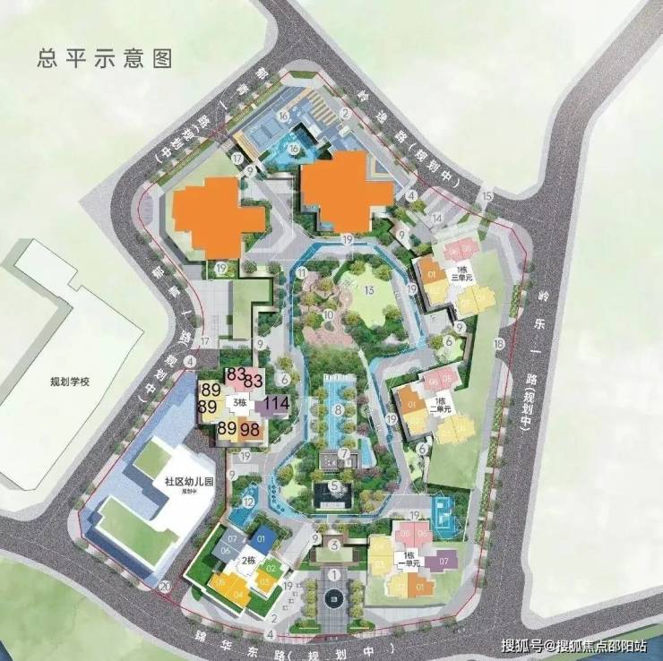 总规划2136户,其中1栋2/3单元为3梯6户,其它栋数均为3梯7户设计,地下4层,规划停车位2343个,车位占比1:1.1。