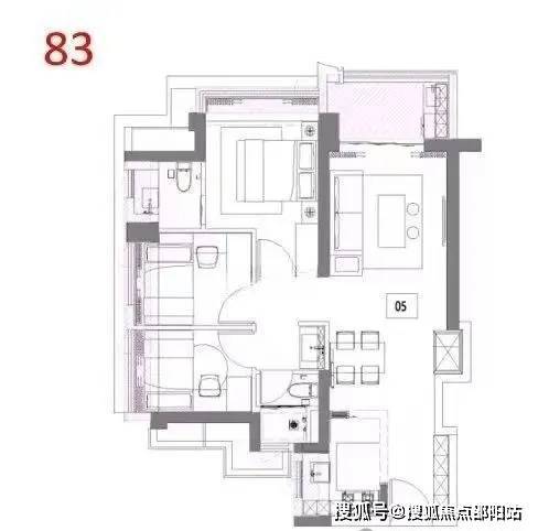 83㎡的3房2厅1.5卫,设计的是竖厅格局,进门入户玄关,LDKB一体化,S墙设计预留冰箱卡槽位,U型厨房,主卫少了淋浴,公卫三段式分离,得房率约92%(包含赠送),阳台西北朝向。