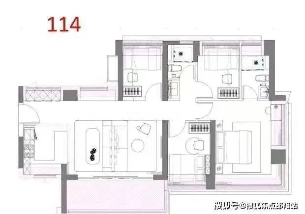 114平㎡的4房2厅2卫,设计的是横厅南北通透格局,进门入户玄关,LDKB一体化,五开间朝南,全屋9面飘窗,主卧大套间,U型厨房,卫生间干湿式分离,得房率约92%(包含赠送),阳台主朝东南向。