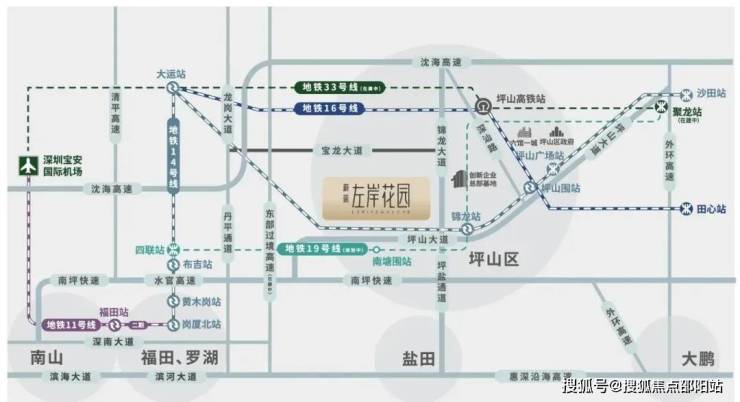地铁14号线:深圳东部首条地铁快线, 4站大运、12站福田岗厦北。地铁16号线:深圳东部组团线路,快速联通龙岗、坪山。地铁19号线(规划中):坪山首条区内地铁线,项目临近14/19号线换乘站锦龙站,南塘围站。