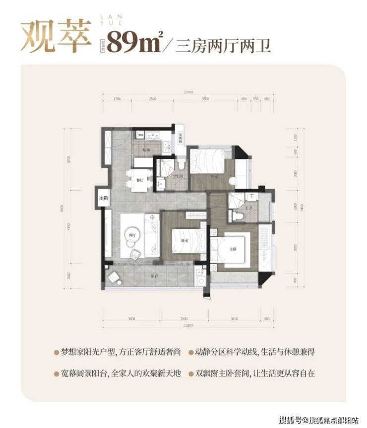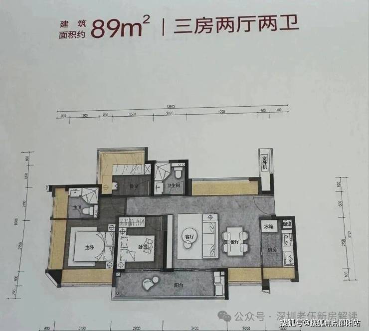 89㎡的3房2厅2卫,设计的是竖厅格局,客厅3.4米开间,LDKB一体化,S墙设计预留冰箱卡槽位,3个卧室分别做到了3.9米/2.9米/2.6米的宽度,客厅连接次卧出6.3米长的大阳台,L型厨房,卫生间干湿分离,有西北、西南或东南朝向。