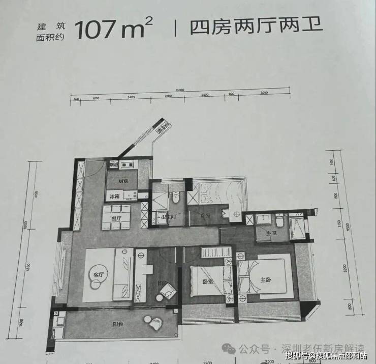 110㎡的4房2厅2卫,设计的是横厅南北通透格局,进门入户玄关,客餐厅6米开间,LDKB一体化,4个卧室分别做到了4.1米/3米/2.5米/2.4米的宽度,主卧套房设计,客厅连接次卧出6.7米长的大阳台,L型厨房,卫生间干湿分离,阳台主朝西南向。