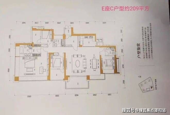 该户型客厅+次卧出阳台长约7.1米,朝向东南,厅为南北通透。