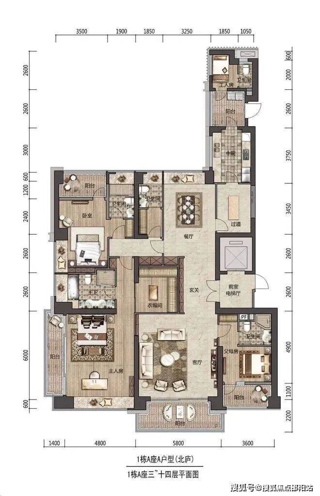 东南朝向,通透布局三面采光,户型方正空间宽敞。客厅开间5.8米,带有2.2米进深大阳台。四套间配置,主卧空间奢侈,采光优秀空能全面。5阳台配置功能全面,餐厨空间宽敞独立,带有独立家政阳台和工人房