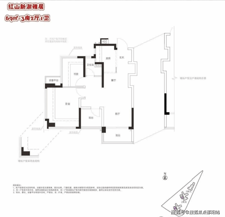 ●69㎡2+1房1卫(朝南):刚需入门王炸户型!竖厅设计节省过道空间,通过S型墙体嵌入冰箱位,阳台与书房区域可改造为房间,实现 “小面积多功能”,69㎡做出3房设计,低总价门槛直接拉满。