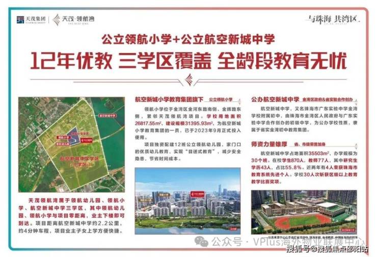 下楼即自配建的领航幼儿园公立12班,领航小学公立36班(已开学),按省一级学校标准建设,教育资源覆盖孩子全年龄教学需求。3所中学:航空新城中学、航空新城初级中学(待建);3所大学:珠海科技学院、广东科学技术职业学院、珠海城市职业技术学院。