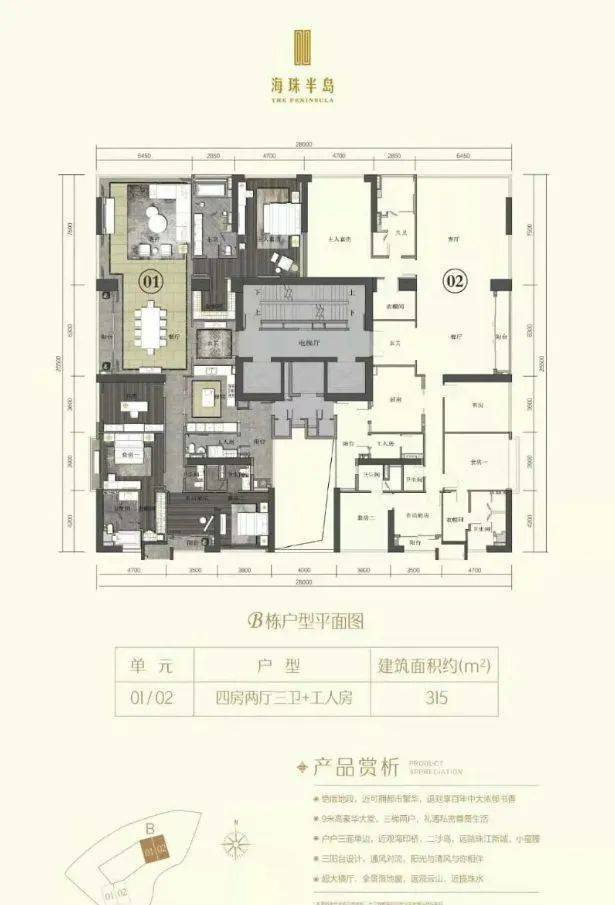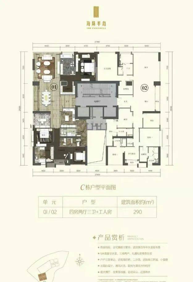 仅有 B、C 两栋 43 层超高层。户型为建面约 290㎡和 315㎡的大平层江景四房,均采用三梯两户的四套房设计,保证了居住的私密性与舒适度,高实用率让空间得到充分利用,满足豪宅居住需求。