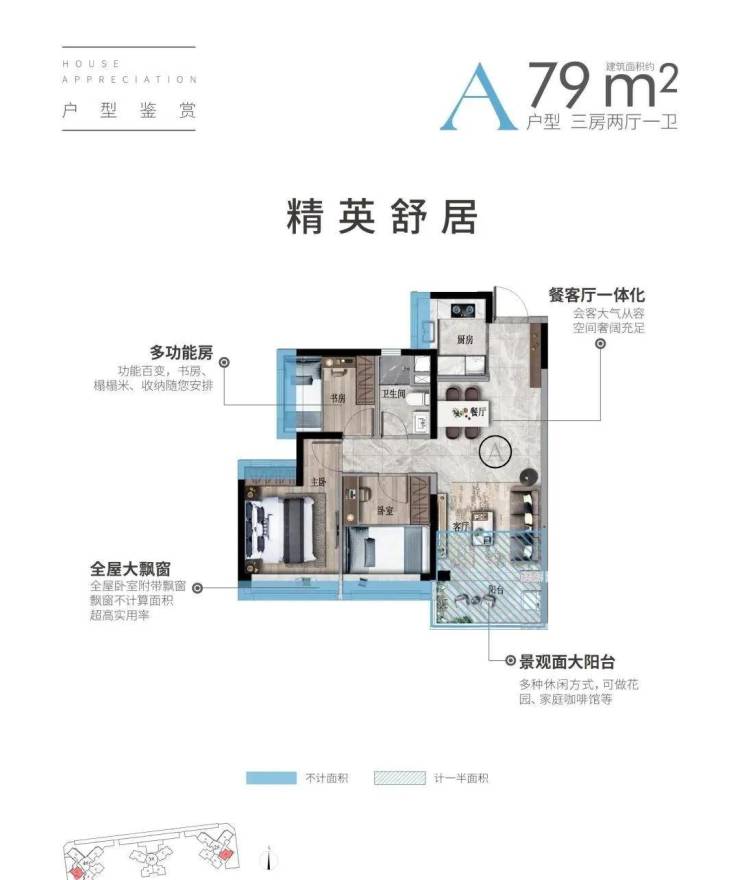 户型:约79㎡三房两厅一卫、89㎡三房两厅两卫、99㎡四房两厅两卫