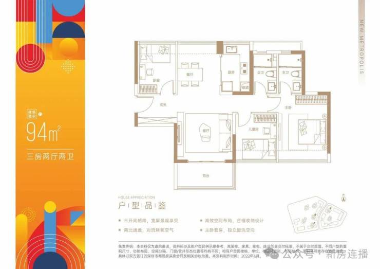 93平3房2厅2卫:经典竖厅设计,使用率77.66%(不包含赠送面积)