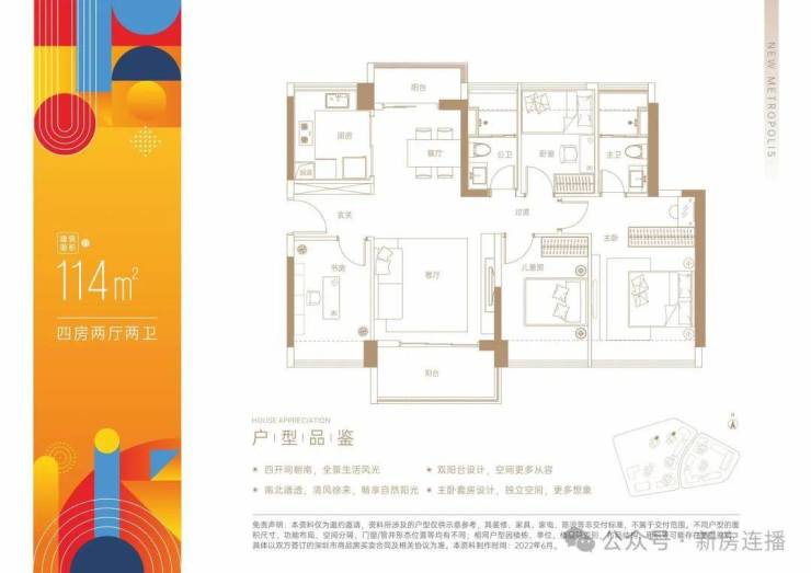 114平4房2厅2卫:南北通错厅设计,使用率77.66%(不包含赠送面积)