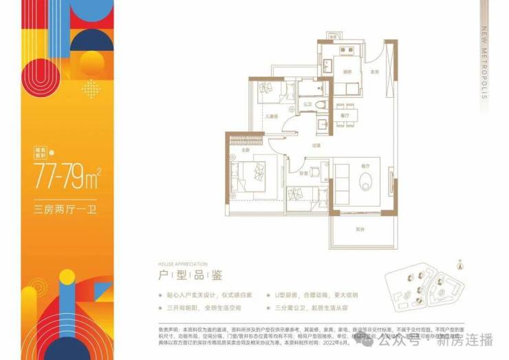 77-79平3房2厅1卫:经典竖厅设计,使用率77.65%(不包含赠送面积)