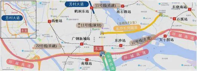 在建的地铁有10 号线广钢新城站和22 号线南漖站,约700米,11 号线鹤洞东站还在建设中。