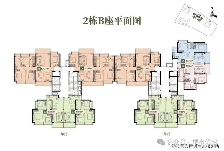 2栋B座二单元04、05户型:面积约为72-74㎡的2房2厅1卫。