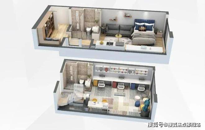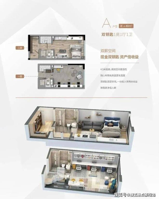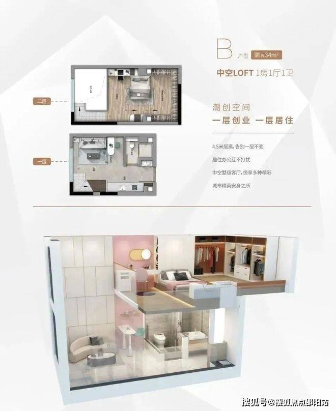 户型:33-58㎡,4.5米层高的 LOFT一房一厅户型,可实现一层办公一层居住。