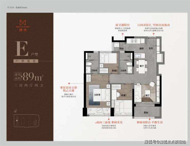 89㎡的3房2厅2卫,A户型(1栋1单元06户型),设计的是经典竖厅格局,进门入户玄关,LDKB一体化,S墙设计预留冰箱卡槽位,三开间朝南,动静分区,主卧双面大飘窗,客厅连接次卧出5.6米长的观景阳台,U型厨房,公卫三段式分离,得房率76.78%(不含赠送),套内面积69.1㎡,东南朝向。