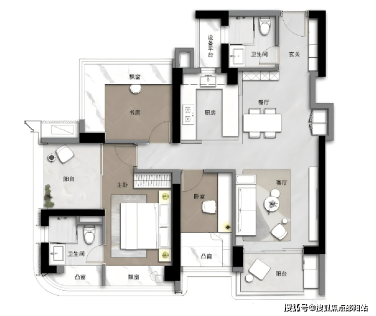 竖厅动静分区,玄关处有个公卫,距离两个次卧较远,主卧套房设计,旁边的阳台可以改做卧室。