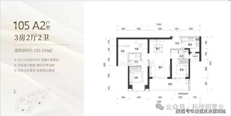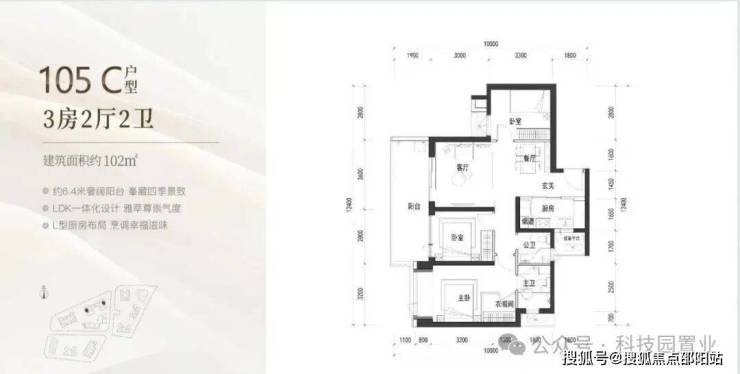 105㎡: 竖厅格局,客厅与卧室连通超大阳台,LDK一体化设计,主卧室270度转角飘窗,看城市景观,主要朝向为西南和东南