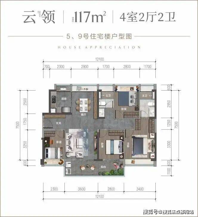 建面约117㎡四房,采光面和景观面约12m,270°朗阔阳台,四季景致肆意入宅,厨房-客餐厅-阳台一体设计,流畅动线充盈全家幸福尺度,生活井然有序,是二胎家庭的优选。