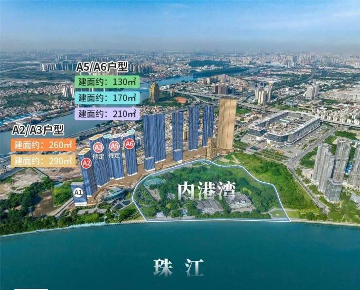 项目位于荔湾白鹅潭CBD核心,紧邻珠江后航道,占地约8万㎡,总建面32万㎡,规划12栋住宅(层高14-57层),主推130-290㎡一线江景大平层,均价约6万/㎡。