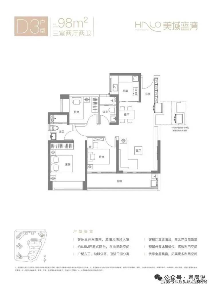 98㎡的3房2厅2卫,D3户型,经典竖厅格局,客厅3.7米开间,LDKB一体化设计,S墙设计预留冰箱卡槽位,动静分区,客厅连接次卧出6.5米长的大阳台,U型厨房,卫生间干湿分离,得房率约80.12%(不含赠送),东南朝向。