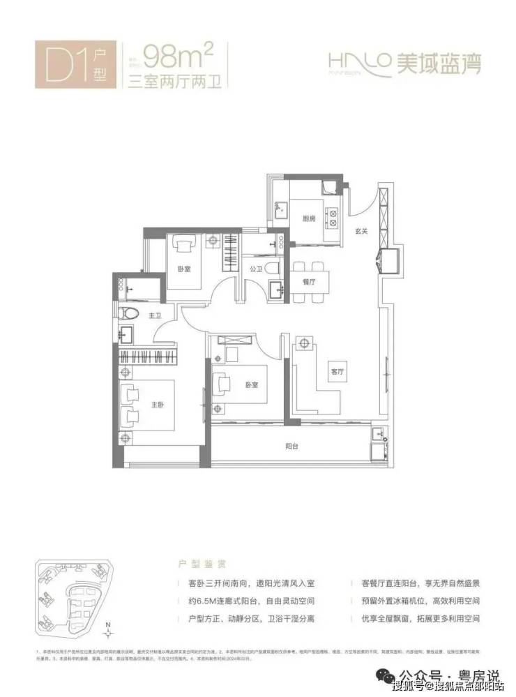 98㎡的3房2厅2卫,D1户型,经典竖厅格局,客厅3.7米开间,LDKB一体化设计,S墙设计预留冰箱卡槽位,动静分区,客厅连接次卧出6.5米长的大阳台,U型厨房,卫生间干湿分离,得房率约80.12%(不含赠送),西南或东北朝向。
