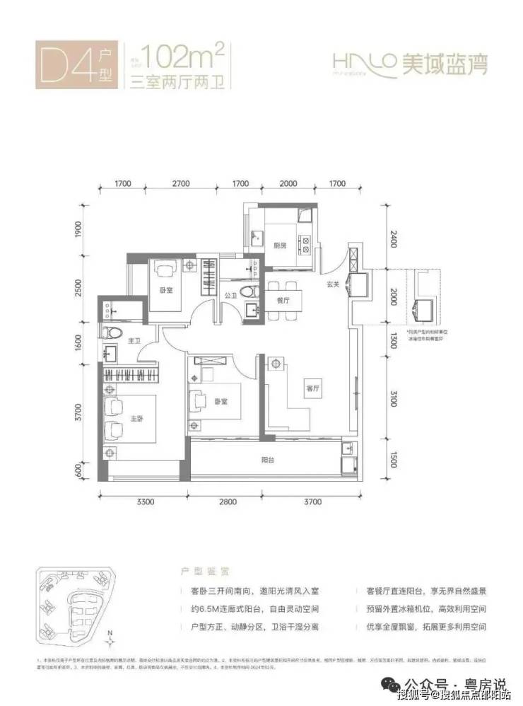 102㎡的3房2厅2卫,D4户型,经典竖厅格局,客厅3.7米开间,LDKB一体化设计,S墙设计预留冰箱卡槽位,U型厨房,卫生间干湿分离,三开间朝南,客厅连接次卧出6.4米长的观景大阳台约9.75m²,东南朝向看小区园林,得房率约75.3%(不含赠送),加上赠送得房率83.97%。