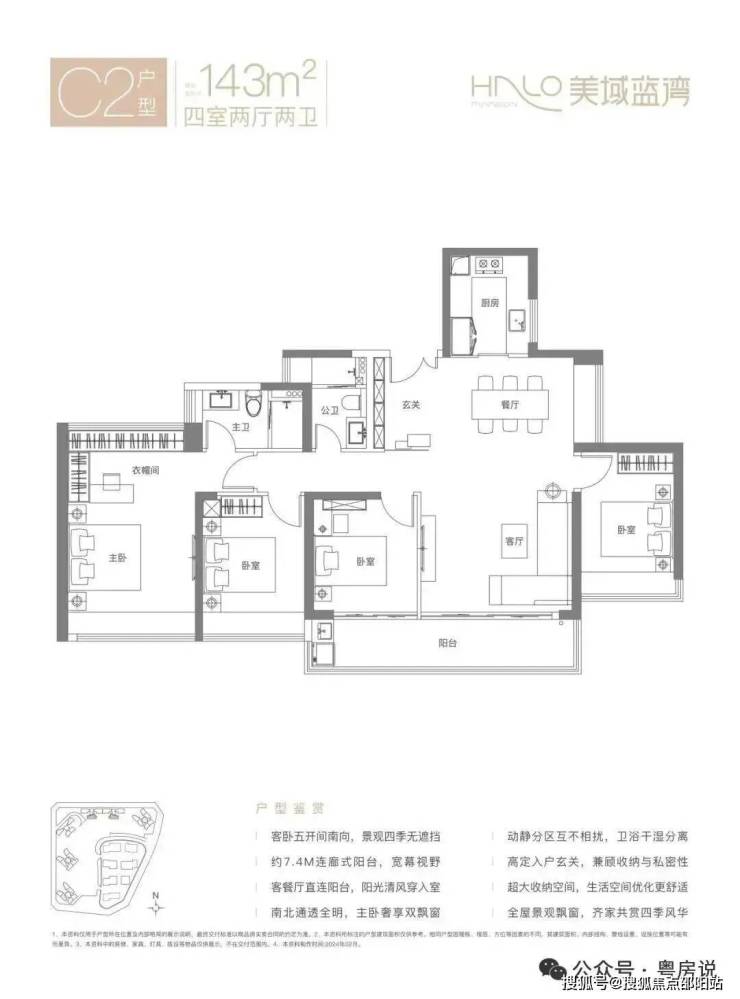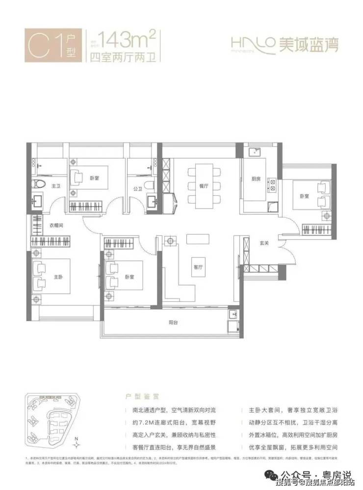 143㎡的4房2厅2卫,C1户型,竖厅南北通透格局,客厅4.2米开间,五开间朝南,客厅连接次卧出7.2米长的巨幕大阳台,U型厨房,卫生间干湿分离,得房率约77.13%(不含赠送),阳台主朝正南向。