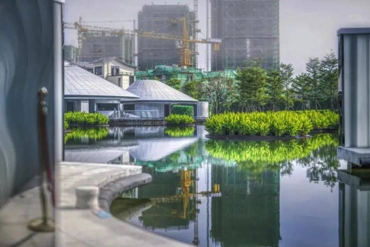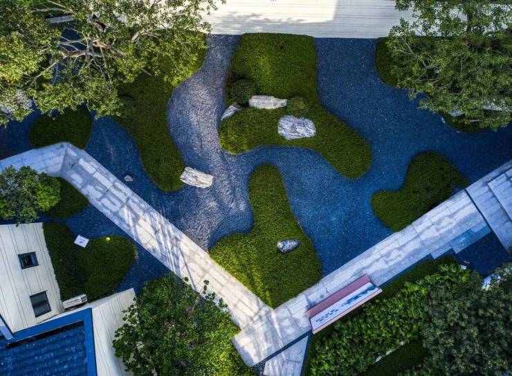 在水景的营造上,为了突出池水整体通透清澈的感觉,自然种植在区域内点缀搭配,颇有自然山林之感,透露儒雅的气息,呈现出理想中的美感。