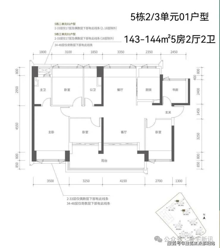【五栋一单元-平面图】3梯3户,3条腿,分别是01、03号房户型约173㎡的5房2厅2卫、02号房户型约149㎡的5房2厅2卫